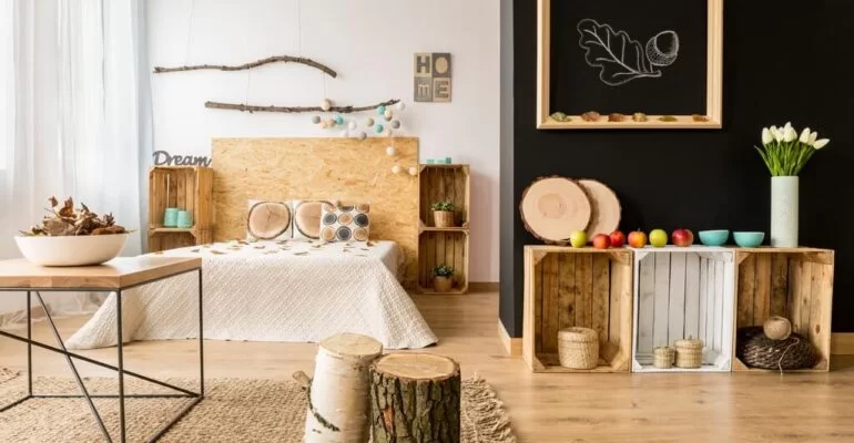 Installing a few wall shelves or a small bookshelf opens up more space for decor. You can find basic shelving and brackets at ManoMano that you can paint to match your room. Use shelves to display plants, books, baskets, photos and other knickknacks. For a rustic look, distressed wood boards mounted to the wall work great.